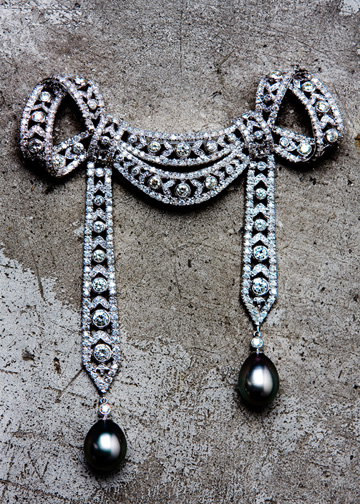 *Edwardian brooch of diamonds and Tahitian drop pearls in white gold. approximately 100cm x 130cm.