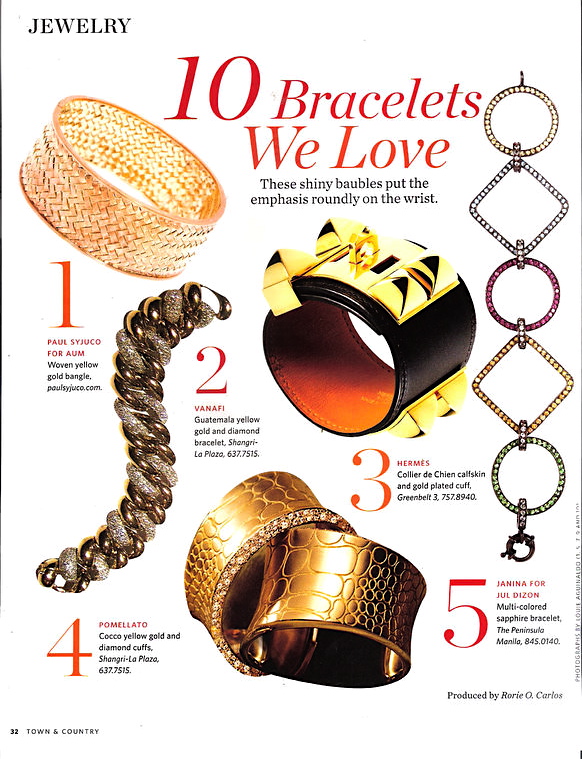 Many thanks again to Rorie Carlos and T&C. You can click on the images to enlarge. Bangle number 1 on the upper left is from Aum; made by hand-weaving strips of yellow gold.