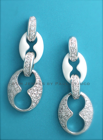 Drop earrings of pave diamonds in white gold and some high-tech ceramic links. Seemingly fragile, these pearlescent white links are extremely tough and can withstand day-to-day wear with ease. Clean, simple lines but bold enough to wear from day to night.