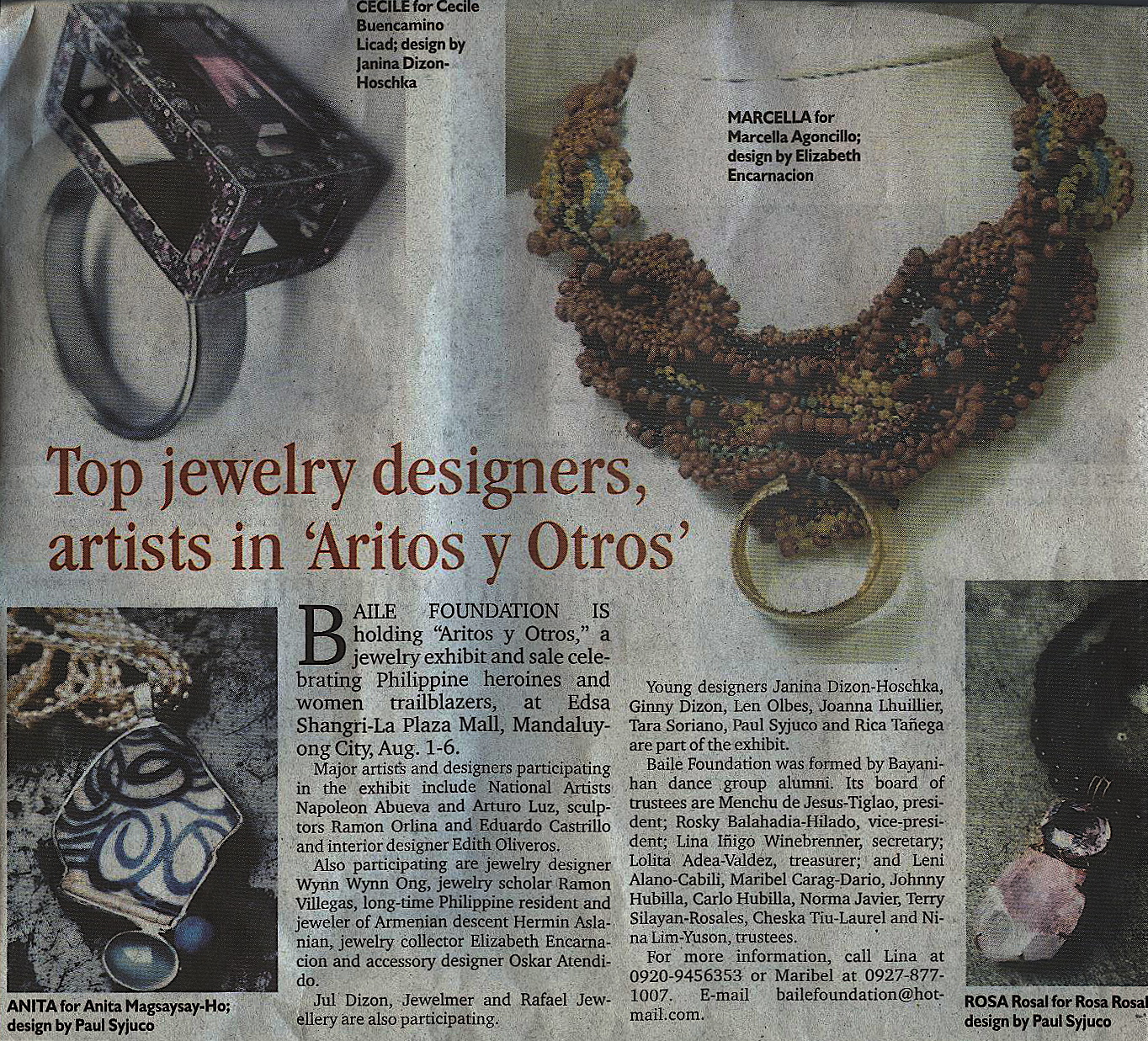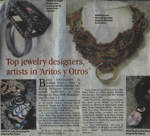 The Baile Foundation and Shangri-La Mall present Aritos y Otros; an art jewelry exhibit celebrating Philippine Heroines and Women Achievers. Show opens on July 31, Thursday, and runs for about a week. Its a group exhibit featuring works by Napoleon Abueva, Arturo Luz, Eduardo Castrillo, Ginny Dizon, Ramon Orlina, Janina Hoschka and myself among others. Above is the spread from yesterday's Philippine Star. And below is the release from the Inquirer.